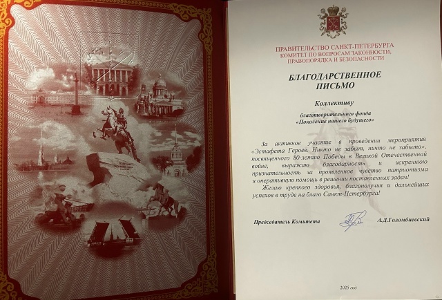 27.11.2025 годаПолучили Благодарственное Письмо от Комитет по вопросам законности, правопорядка и безопасности за Активное участие в проведении мероприятия в " Эстафете Героев " по правилам «Федерации практического атлетического многоборья» Которое прошло 16 августа, на стадионе «Петровский» в Санкт-Петербурге.